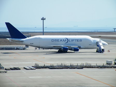●中部国際空港に駐機中の「DREAM LIFTER」(ドリーム リフター)。B787の機体の一部を日本で製造し、運搬するために作られた貨物機です。世界に4機しかありません。
